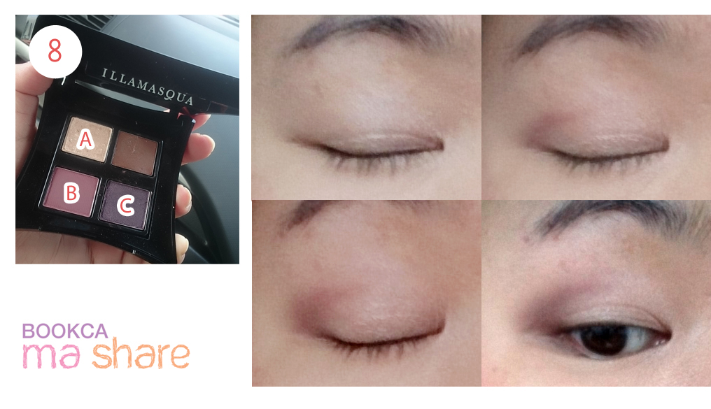 สี B ตัดเป้าตามภาพ จากนั้น blend eye shadow ให้ฟุ้งออกให้ดู soft ลงค่ะ