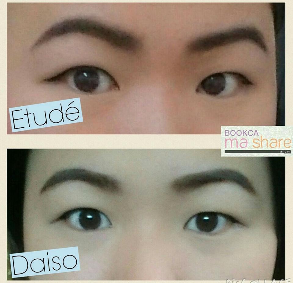 ส่วนสีของ Daiso ในภาพจะออกแดงกว่าเพราะเป็นสี brown (Daiso มีให้เลือก 2 สีนะคะ คือ สีdark brown และสี brown ว่าเดี๋ยวจะลองซื้อ Dark brown มาลองดูบ้างว่าจะเหมือน Etude ไหม)