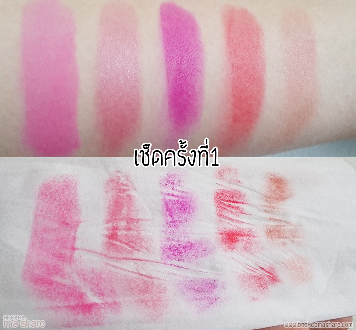 เพื่อทดสอบประสิทธิภาพของลิปสติกว่าแต่ละแบรนด์จะติดทนแค่ไหน บุ๊คก้าเลยลองใช้ทิชชูเช็ด โดยภาพนี้คือการเช็คครั้งที่ 1