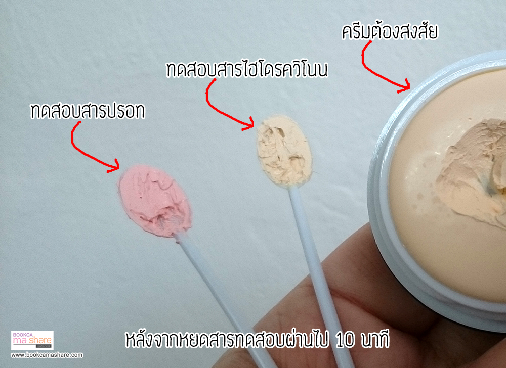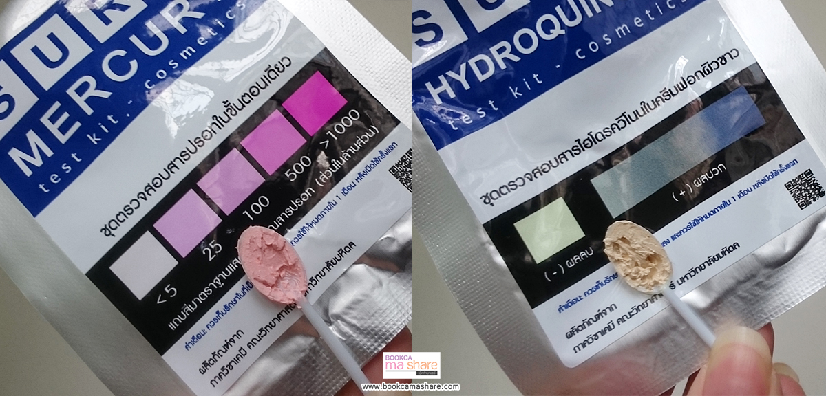 หมายเหตุ : สำหรับการทดสอบนี้เป็นการทดสอบเบื้องต้น ด้วยชุดทดสอบสารปรอท และสารไฮโดรควิโนนในครีมฟอกผิวขาว MercUryTest Kit ผลิตโดยนักวิจัยของคณะวิทยาศาสตร์ มหาวิทยาลัยมหิดล