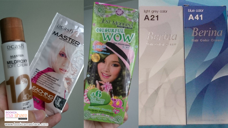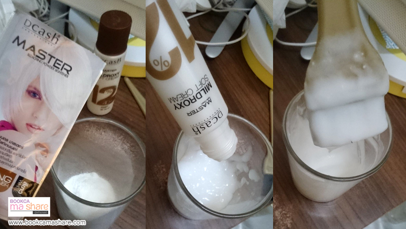 สำหรับการทำสีวันนี้บุ๊คก้าจะทำให้ด้านบนสว่างและไล่ลงมาเข้มที่ด้านล่างนะคะ เลยใช้ผงกัดและน้ำยาแค่ 1 Set ถ้าใครผมประมาณบุ๊คก้า แล้วจะกัดสีให้เท่ากับทั้งหัว ต้องใช้ 2 Set นะคะ (แต่ถ้าเป็นคนผมน้อย ใช้ 1 Set ก็น่าจะพอไหม แต่ถ้าผมหนามากอาจต้องเพิ่มเป็น 3 Set แล้วแต่ปริมาณผมของแต่ละคนค่ะ)