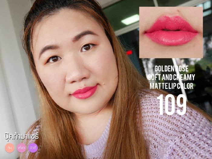 มาดูสีกันชัดๆ ในภาพนี้เนื้อลิปดูไม่ค่อยแมทเท่าไหร่ บอกตามตรงว่าทาแล้วเนื้อไม่แมทแบบที่คิดไว้ แต่ออกแนวฉ่ำ และชุ่มชื่นปากมากกว่า ถ้าอยากให้แมทต้องทับด้วยแป้งฝุ่น พอทับแล้วแมททันที และกลายเป็นเนื้อแมทไปเลย สีของลิปสติก