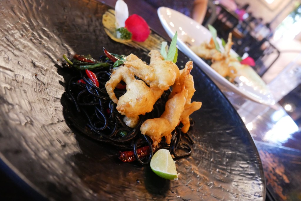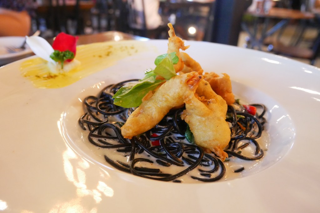 เรามาเริ่มที่เมนูแนะนำที่ถ้ามาถึงร้านนี้แล้วต้องสั่ง กับเมนู สปาร์เก็ตตี้เส้นดำซอสครีม ที่ร้านมีให้เลือกกินกับเนื้อสัตว์หลายแบบ ด้วยความชอบปูนิ่ม เลยจัดเป็นปูนิ่มมา สำหรับเมนูนี้ เส้นดำเลิศมาก อร่อย ไม่คราว เส้นนิ่มกำลังดี ส่วนซอสก็ รสเข้มข้มกำลังดี หอม มัน และสำหรับปูนิ่มนั้น เราว่าชุบแป้งมาหนาไป ทำให้ได้รับรสปูนิ่มไม่มากเท่าที่ควร